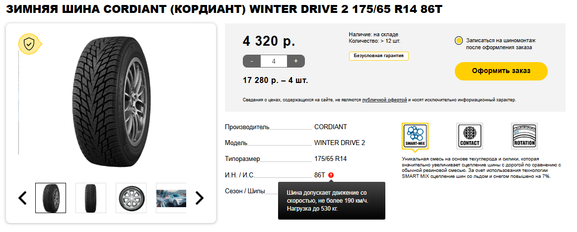 Для большего удобства, данные значения на нашем сайте указываются и рассчитываются на каждую шину. Так, например, Зимняя шина CORDIANT WINTER DRIVE 2 175/65 R14 86T имеет индекс нагрузки 86, а индекс скорости – указан буквенным значением T.