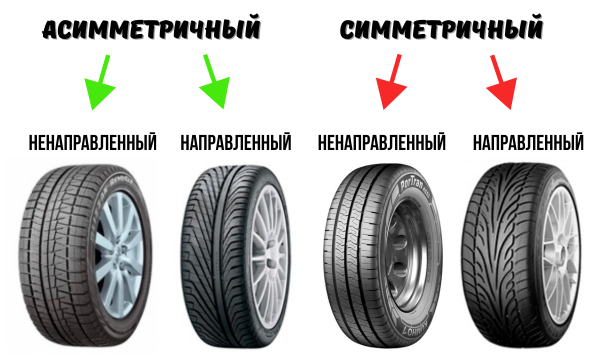 • Ненаправленные асимметричные. Автошины этого типа зачастую отличаются повышенной производительностью. Асимметричный ненаправленный рисунок более приспособлен к переменчивым условиям эксплуатации. При их установке важно соблюдать не направление вращения, а расположение внешних и внутренних плечевых зон. Если шина установлена наружным плечом внутрь, она не будет работать «в полную силу».